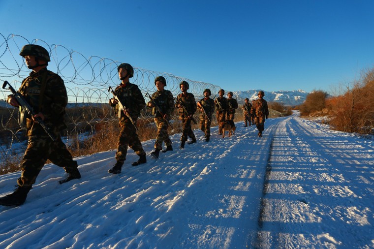 武警新疆伊犁边防官兵联合解放军边防连队在伊犁州霍城县边境地区巡逻(1月30日摄)。