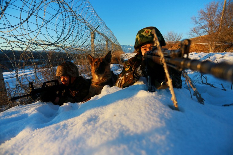 一名武警新疆伊犁边防官兵(右)和一名解放军边防连战士在霍城边境地区参加联合演练(1月30日摄)。