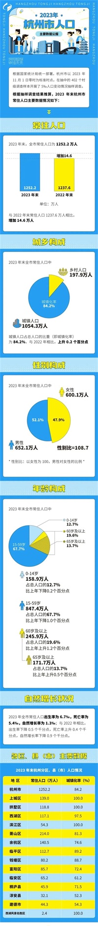 今天上午,市统计局发布2023年杭州市人口主要数据公报:2023 年末,全市常住人口为 1252.2万人,与2022年末常住人口1237.6 万人相比,增加 14.6万人。各区县(市)人口情况公布,详情↓↓