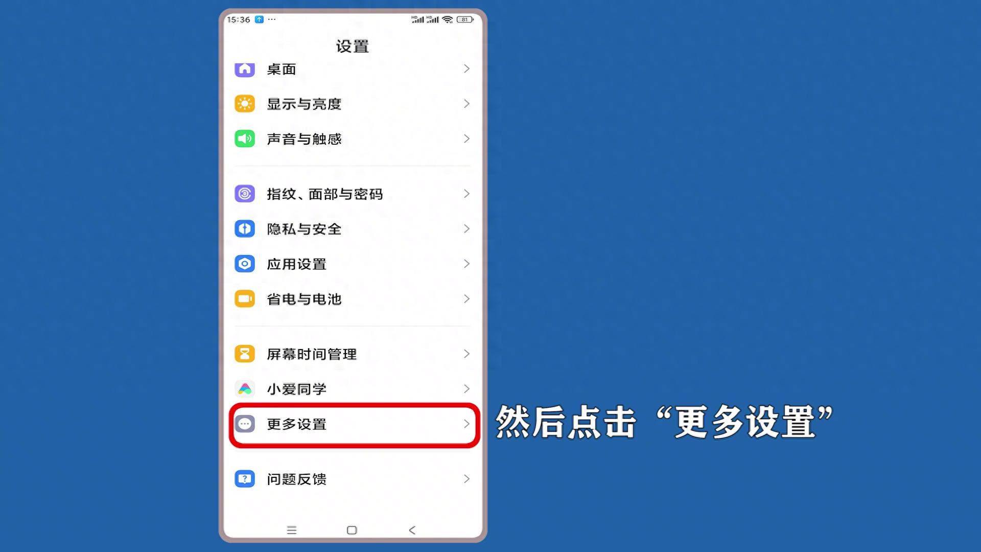 ·打开手机桌面的"设置",进入设置,向上滑动,然后点击"更多设置"。