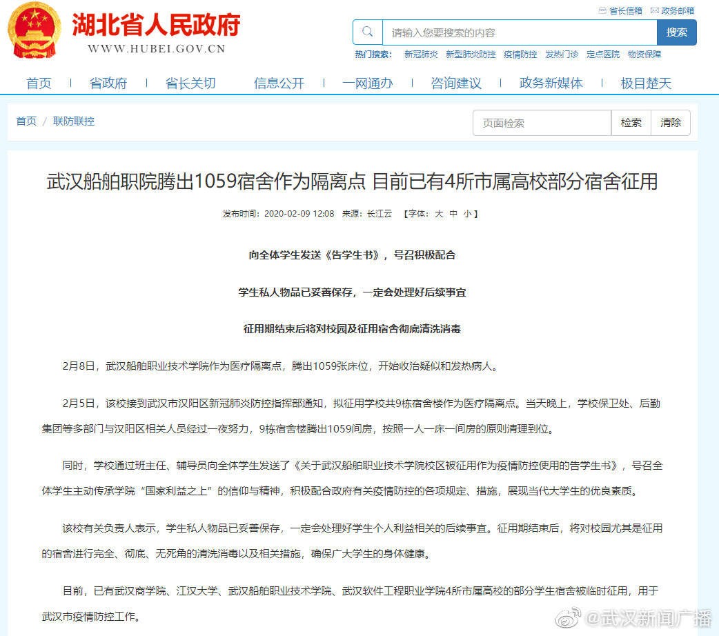 2月8日,武汉船舶职业技术学院作为医疗隔离点,腾出1059张床位,开始收治疑似和发热病人。目前,已有武汉商学院、江汉大学、武汉船舶职业技术学院、武汉软件工程职业学院4所市属高校的部分学生宿舍被临时征用,用于武汉市疫情防控工作。(来源:湖北省人民政府门户网站)