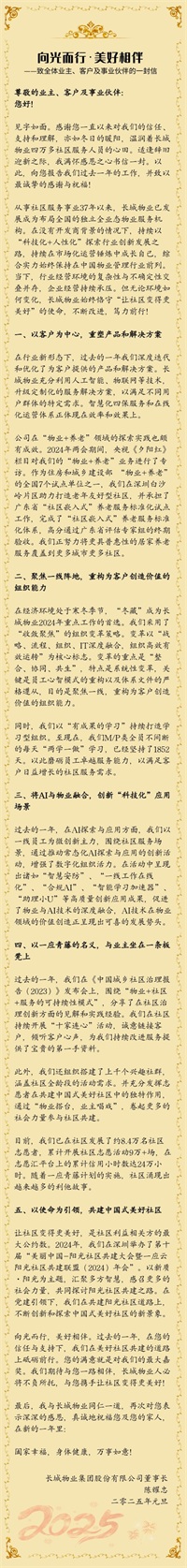 乐居财经 李兰1月1日,长城物业集团发布2025年新年贺信。