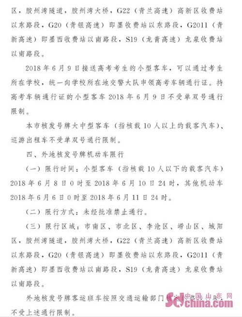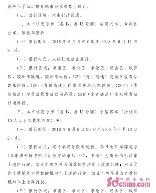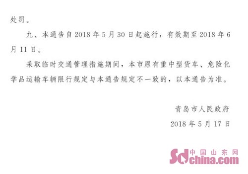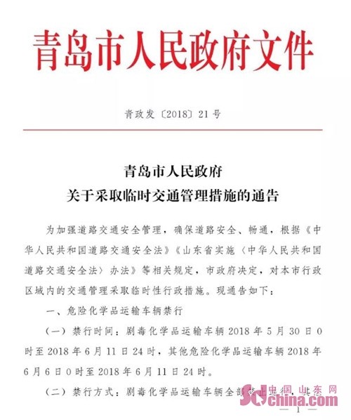 中国山东网青岛5月29日讯5月28日,青岛交警官方微信公众号发布《青岛市政府关于采取临时交通管理措施的通告》。根据《通告》,青岛市行政区域内,剧毒化学品运输车辆自5月30日0时至6月11日24时全部禁止通行,其他危险化学品运输车辆自6月6日0时至6月11日24时未经批准禁止通行。6月8日20时至6月10日24时,青岛市小型客车单双号限行。