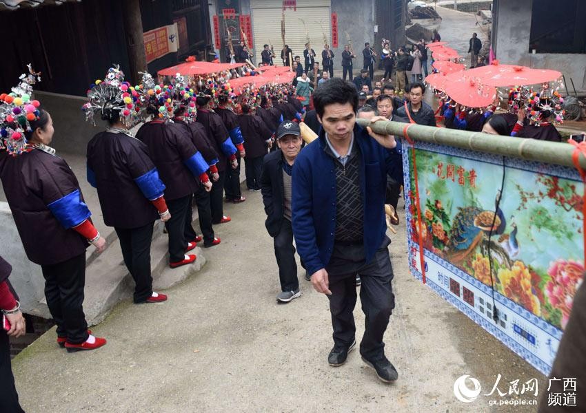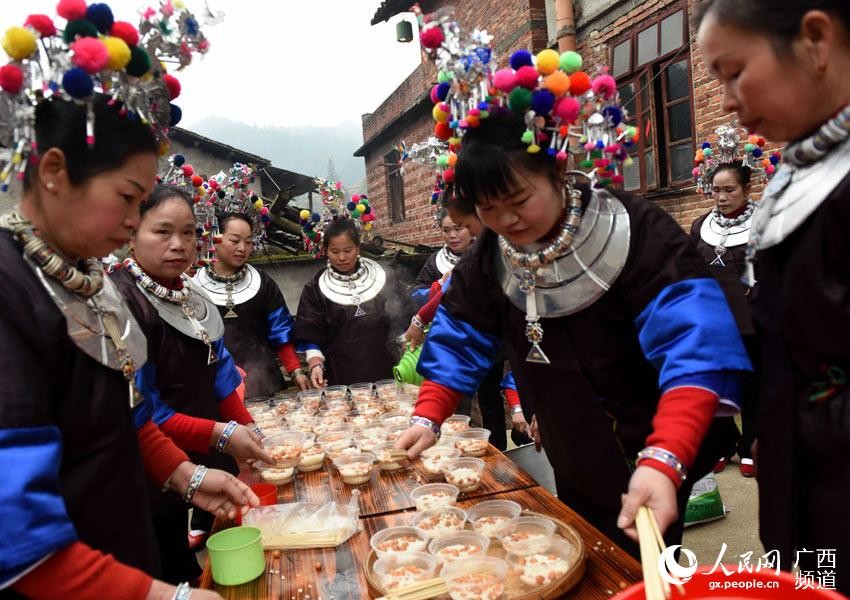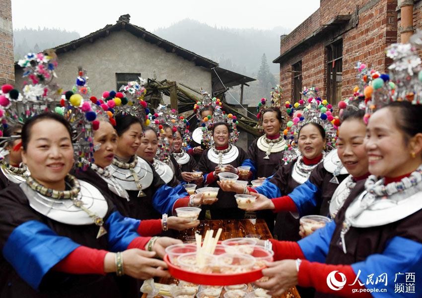 人民网三江2月28日电 2月26日,广西三江侗族自治县林溪镇平岩村平坦屯举办鼓楼落成庆典,程阳八寨村民到场祝贺,以打油茶、开门仪式、多耶、百家宴及文艺表演等节目欢庆新楼落成。鼓楼是侗族村寨的标志性建筑,从形式上分为歇山式(俗称屋顶形,因侗族房屋多为歇山顶形而出名)和攒尖顶式(俗称伞顶或尖顶)。鼓楼全用杉木凿榫衔接,不用钉铆,结构精巧,造型美观。(庞革平、龚普康)