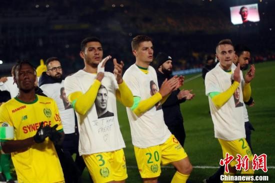 当地时间1月21日,刚刚从法甲南特转会到英超球队卡迪夫城的萨拉乘坐飞机前往威尔士的过程中,在英吉利海峡上空失联。图为南特球员在进球后展示印有萨拉头像的内衬。