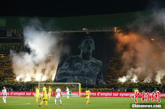当地时间1月30日,法甲第22轮南特对阵圣埃蒂安的比赛前,南特队员和球迷一起悼念南特球队前球员,乘坐飞机在英吉利海峡上空失联的萨拉。当地时间1月21日,刚刚从法甲南特转会到英超球队卡迪夫城的萨拉乘坐飞机前往威尔士的过程中,在英吉利海峡上空失联。30日,据外媒消息,英国航空事故调查局表示,法国同行们疑似找到了2块萨拉失事飞机上的坐垫。图为球迷在比赛中打出印有萨拉画像的巨幅tifo。