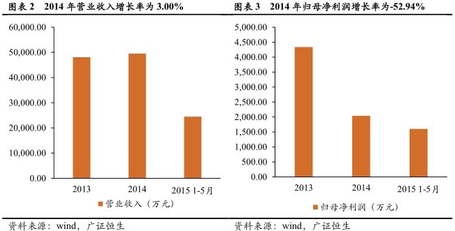 2015年1月至5月营业收入24468.62万元,归母净利润1602.76万元。公司2015年年1-5月份扣除非经常性损益后的净利润恢复到正常盈利水平,主要原因是是2015年整体情况开始好转,公司为了节省开支、控制费用规模,降低了营销费用的投入。