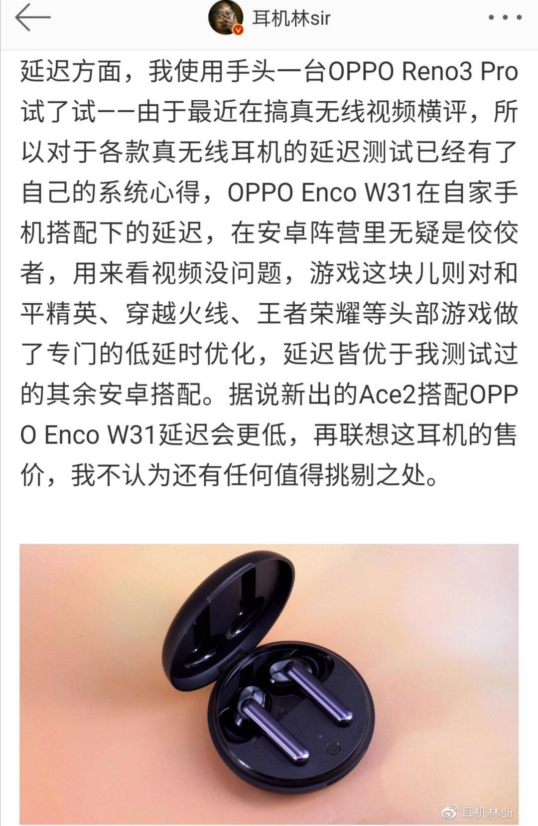 那使用如此超低延时的耳机打游戏究竟有多刺激呢?知名科技大V@耳机林sir 就使用OPPO Reno3 Pro搭配OPPO Enco W31进行了测试,发现看视频玩游戏均有不错的体验。而且在玩《和平精英》时,佩戴OPPO Enco W31真无线耳机不仅能清晰地听到队友的语音,还可以在房间里清楚且近乎无延时地听到外面的脚步声,根据脚步声就可以轻松地锁定敌人,达到出其不意的击杀效果。