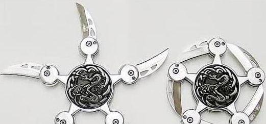 五位十方刀,这把刀内部设置卡锁,外面镶嵌五个刀头互相卡锁,平时不用的时候是闭合状态,投掷时轻轻按下中间的按钮便可伸出五把小刀,弹簧折叠驱动,在快速的旋转中,杀伤力非同小可。