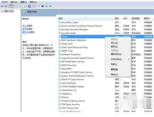 点击开始,输入“服务”,回车。在打开的服务中,确保Print Spooler、Server、Workstation这三个打印服务正常启动运行,显示“已停止”的话,右键点击该服务,选择“启动”即可。