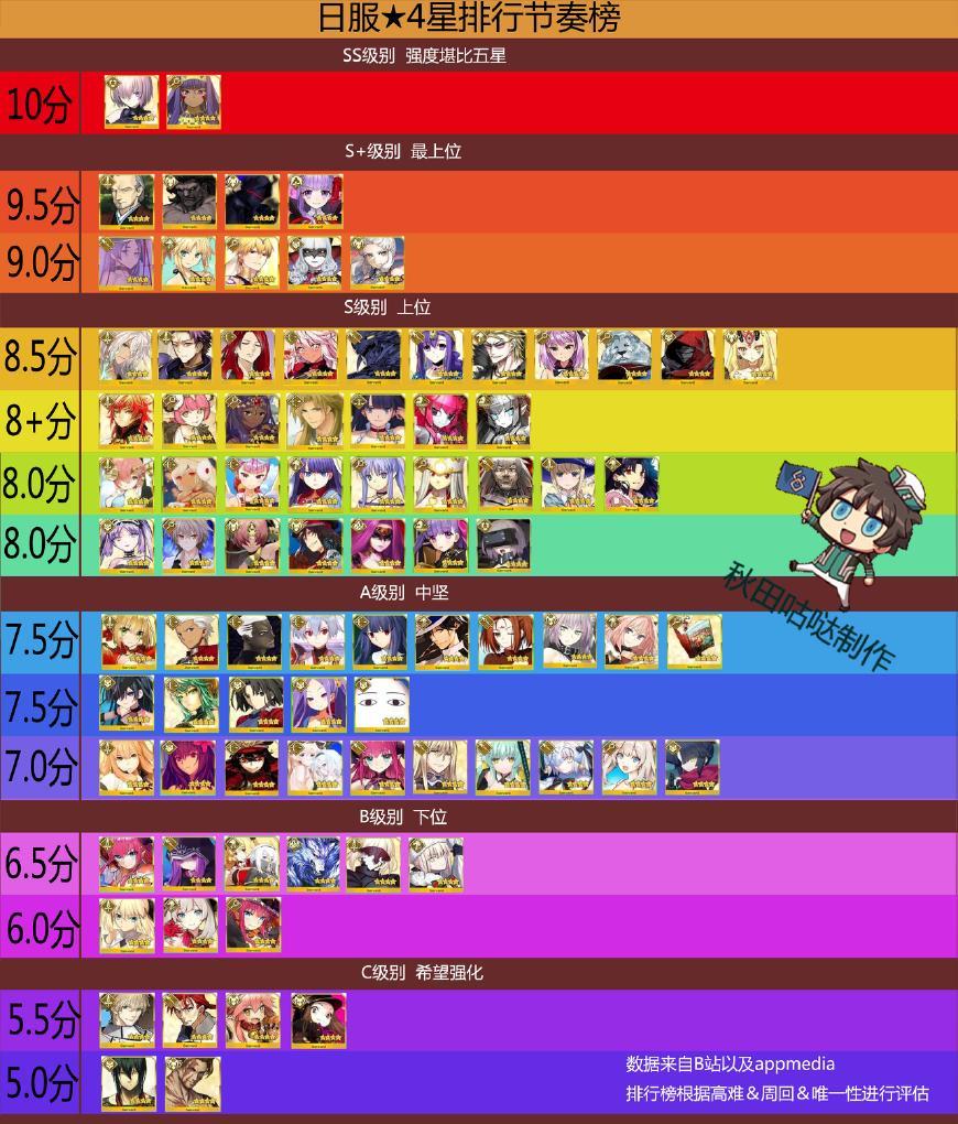 哈喽小伙伴们好呀!本期为大家带来日服appmedia整理的四星从者节奏榜,此排行榜根据从者在周回本、高难本的表现以及从者的唯一性进行评估,选从者看强度的可以适当参考,真爱党的小伙伴看个热闹就行了。