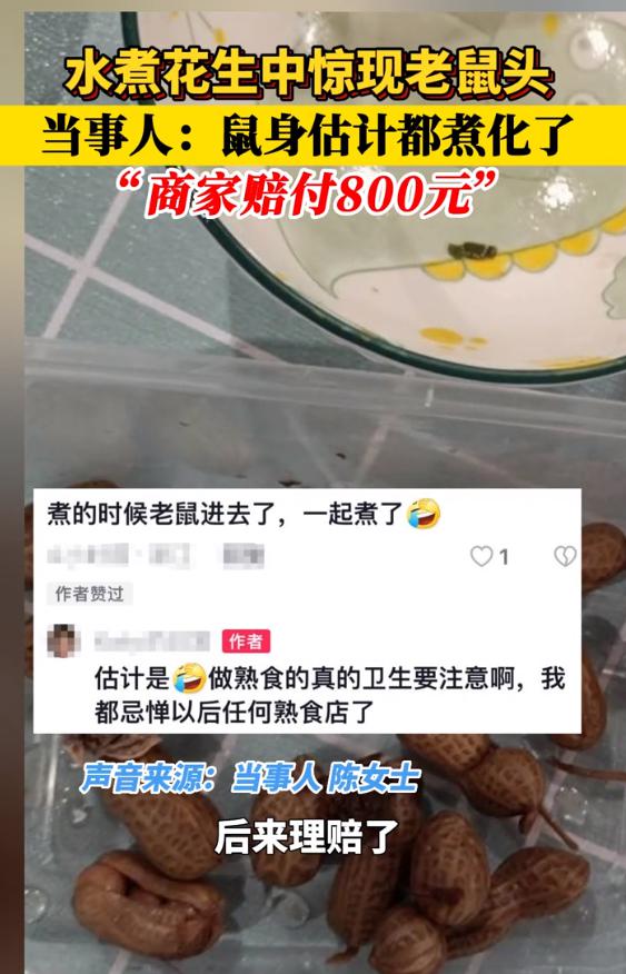 近日在浙江绍兴,一女子称自己在购买的水煮花生中发现老鼠头,此事引发关注。