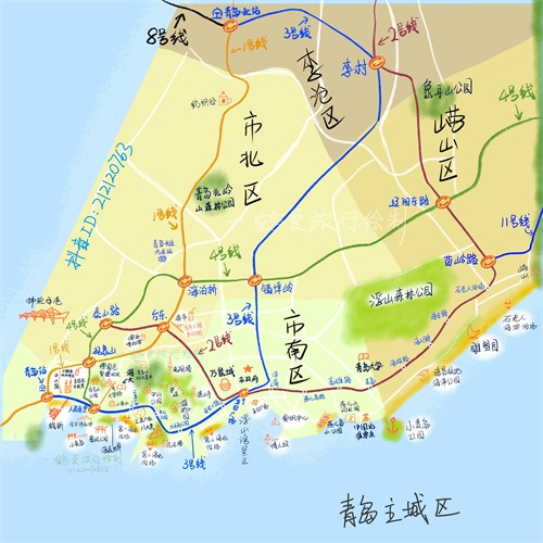 青岛手绘旅游攻略路线图来啦,主城区景点分布一览,请收好