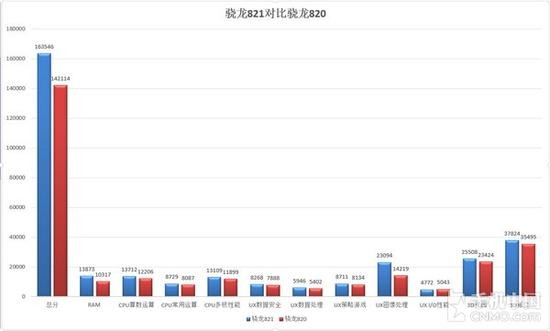 骁龙821手机的总得分为163546,而骁龙820手机总得分为142114。在单项环节的对比上,骁龙821也差不多做到全面压制,特别是在CPU、图像运算以及3D性能方面,骁龙821的优势都比较明显。