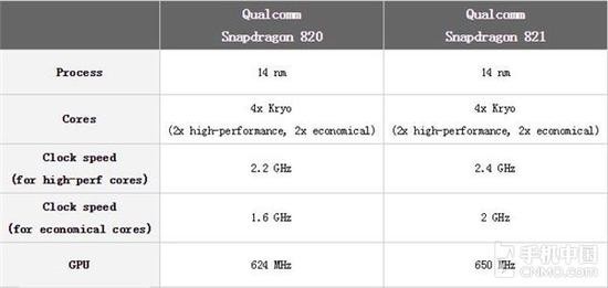 骁龙821与骁龙820,都采用14nm FiFET三星第二代LPP工艺技术、全新四核64位Kryo CPU以及Adreno 530 GPU,主要的区别还是在主频上。