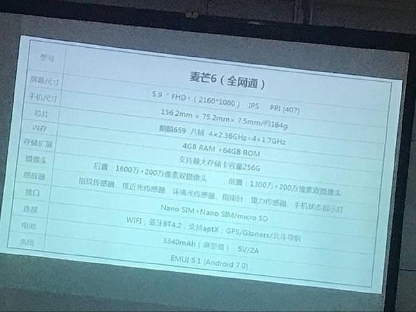 华为麦芒6参数全曝光 全面屏四摄麒麟659