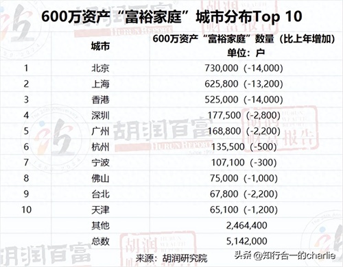 4、中国现在至少有50个城市拥有1万多户“富裕家庭”,有42个城市拥有5000多户“高净值家庭”,有37个城市拥有500多户“超高净值家庭”
