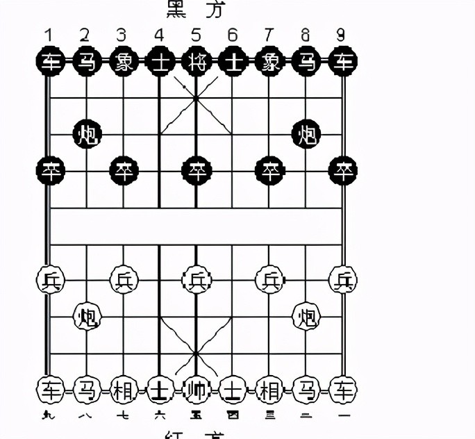 分为相同两部分,红黑双方各占一边,为了便于学习和记录,棋盘中的九条直线红黑双方各从自己方从右到左数,红方用汉字一至九表示,黑方用1-9表示。