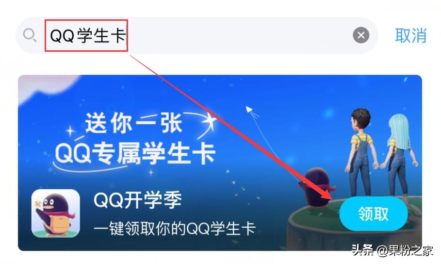 查询的方法也非常简单,我们只要打开QQ主界面,点击顶部搜索栏,搜索“QQ学生卡”,点击领取即可。