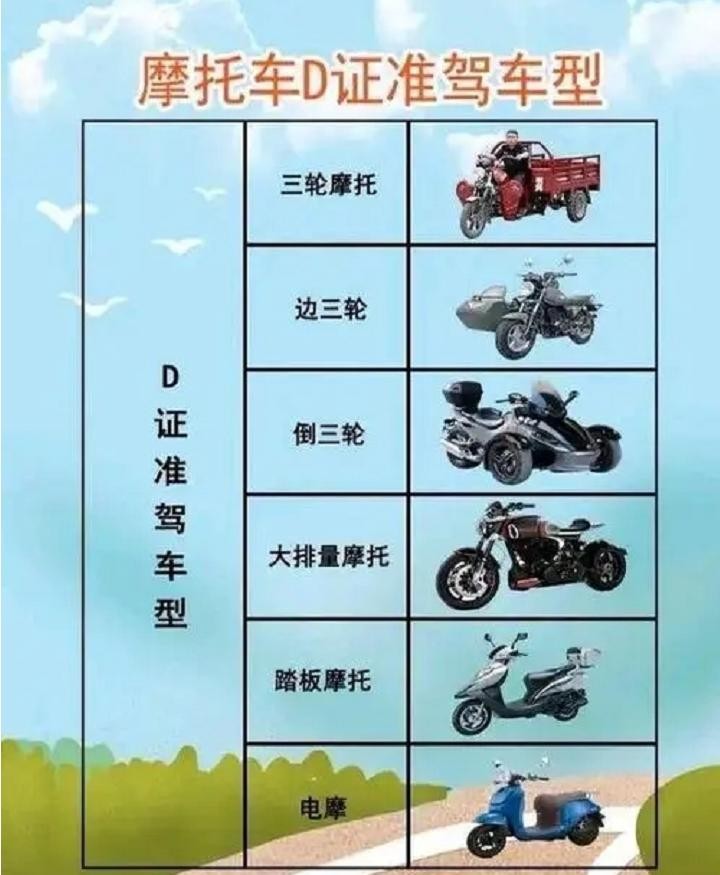 而另外的D驾照,又可以准驾三轮摩托车(含电动三轮车),边三轮、倒三轮、大排量摩托、踏板摩托、电摩(含电动摩托车、电动轻便摩托车)。