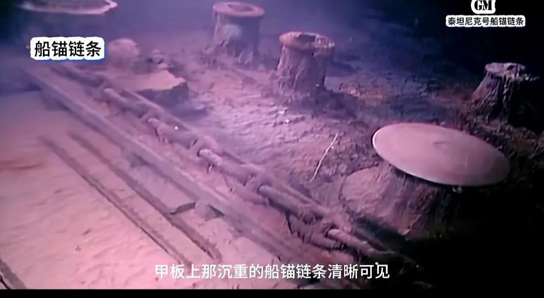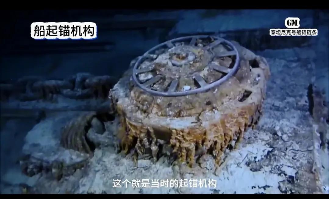 首先映入眼帘的是巨大的船锚,据史书记载,泰坦尼克号一共有三个船锚,最大的一个重达15吨,而旁边这个是小的,只有几吨重。虽然船锚是由更耐腐蚀的铸铁制成,但也经不住百年海水的侵蚀,估计再过几百年连残渣都不剩了。甲板上那沉重的船锚链条清晰可见,虽然经历了百年海水的腐蚀,却奇迹般地保持了相对完好的状态。这也归功于当初选用了更加耐腐蚀的铸铁材质制成,整艘泰坦尼克号的船锚总重量接近100吨,这个就是当时的起锚机构。动力由蒸汽机提供,而位于锚链旁边这种圆盘,它是辅助锚链起放的一种机械绞盘。虽然在海中浸泡了上百年,但它最上面一层使用的是青铜材质,所以表面几乎看不出被腐蚀的痕迹。