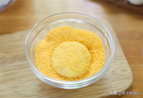 再均匀裹上面包糠,稍微按压一下以免面包糠脱落