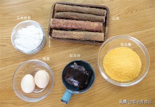 山药200克 / 鸡蛋2个 / 玉米淀粉20克 / 面包糠40克 / 红豆沙40克 / 玉米油10毫升