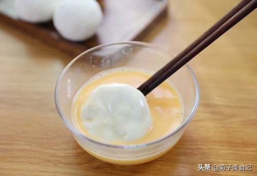鸡蛋先打散,把压好的山药饼均匀裹上蛋液