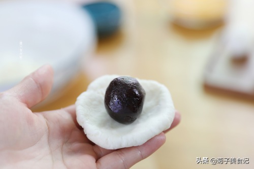 将山药剂子压扁成一个小窝的形状,再把红豆沙放在中间,慢慢收口后再按压成饼状