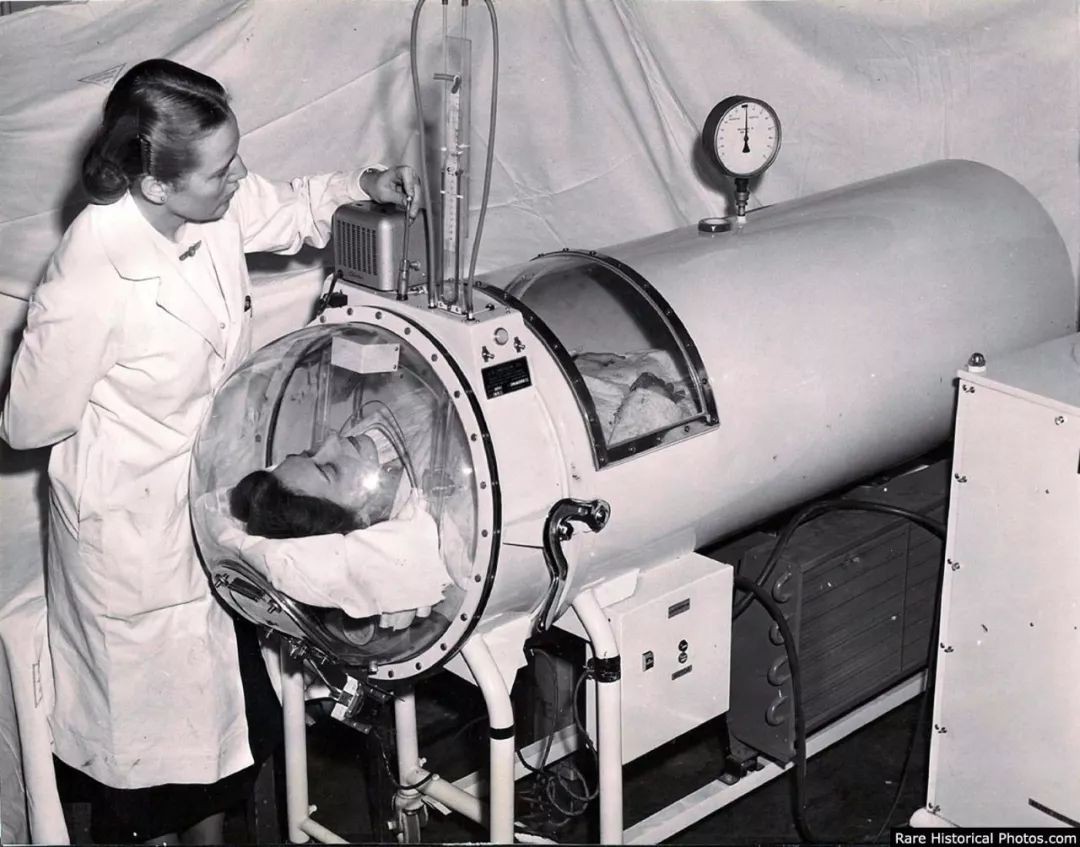 在上世纪四五十年代,美国各地的医院都放满了一排排的铁肺。脊髓灰质炎患者利拉德回忆道:“在满是金属筒的房间里,尤其是有风暴时,所有患者都被转移到同一个房间,这样护士们就可以在断电时手动运转铁肺。”利拉德还说,“你躺在那儿只能听见自己的心跳,这场景很可怕。房间内仅有的响声就是当有人无法呼吸时的响舌声。偌大的、充满黑暗的病房好像是个巨大的、充满咯咯声的养鸡场。所有的护士都在说,‘稍等一下,你马上就能呼吸了。’” 1954年以后,随着脊髓灰质炎疫苗接种范围的扩大,像铁肺这样大型机械的需求逐渐减少,铁肺退出了历史舞台,后来也鲜有人知道它的故事。