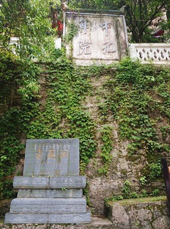 紫阳书院,以祀朱文公朱熹号紫阳之名而来。对面悬崖上书“飞岩”二字,笔力苍劲。紫阳书院由三角亭、考祠、老君殿、圣人殿组成。三角亭是一座比较罕见的亭子,牌匾上的“谐趣”二字代表儒、释、道三教文化在此和谐共存的景象。