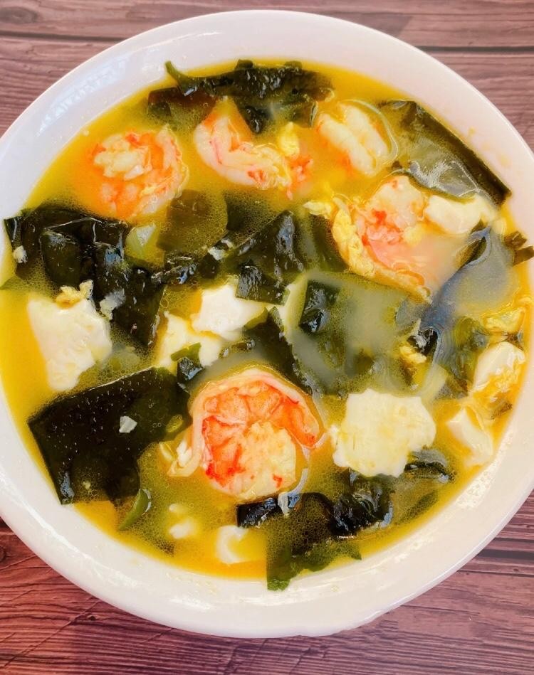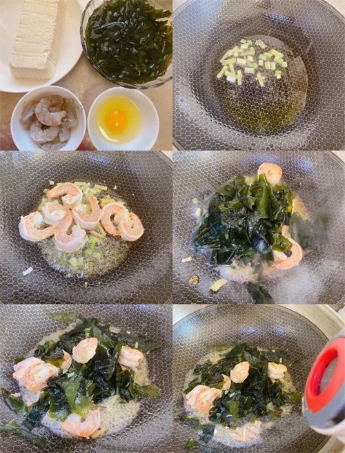 食材:裙带菜适量,大虾8只,嫩豆腐一盒,鸡蛋1个,小葱1棵,姜3片,盐适量,胡椒粉少许。1️⃣准备好所有食材,裙带菜清水泡发,大虾去壳去虾线洗净,鸡蛋打入碗中打散,豆腐切小块备用。