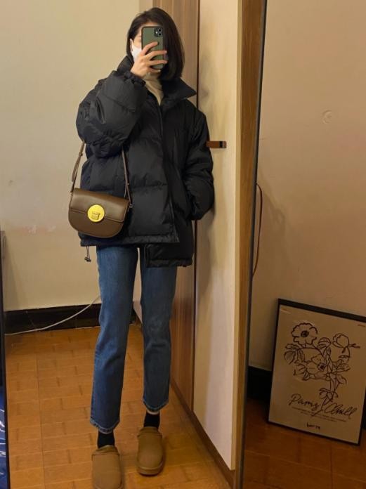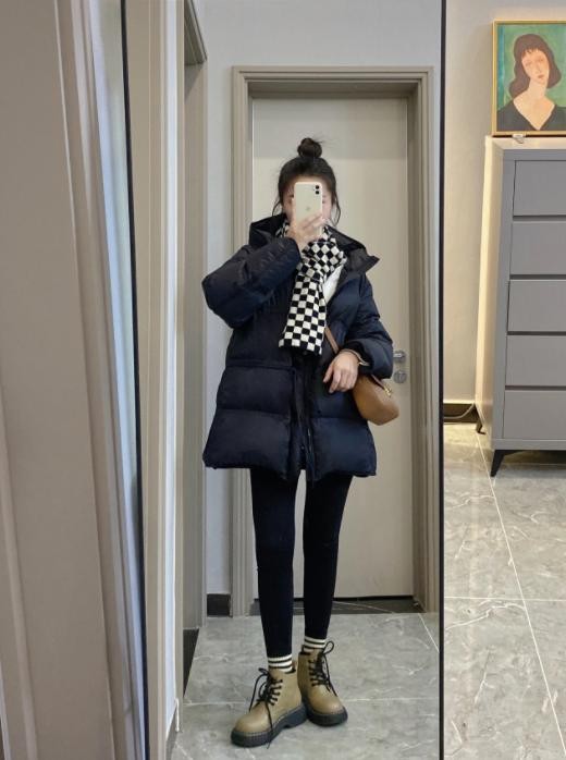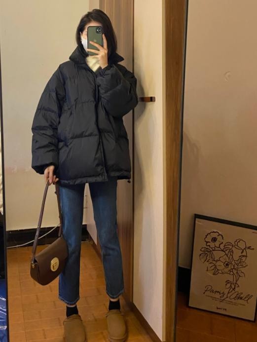 冬天最爱还是黑色,离不开舒服保暖的黑色羽绒服!搭配一条紧身牛仔裤,天气再冷也不怕!