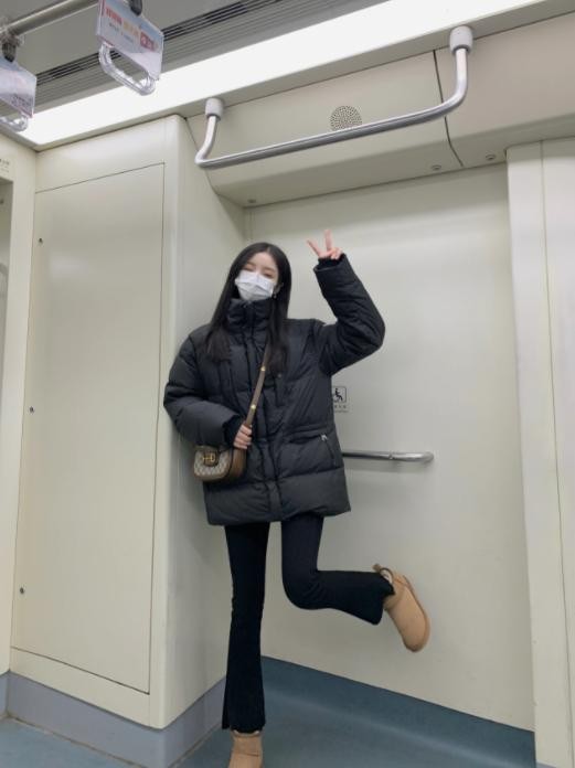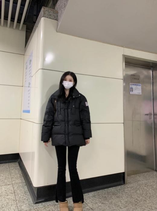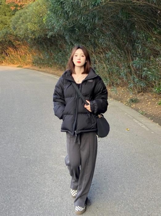 冬天必备的黑羽绒服,短款是小个子福音,真的很保暖!版型设计也非常韩系!搭配深灰色卫裤,垂感非常棒,显腿长!