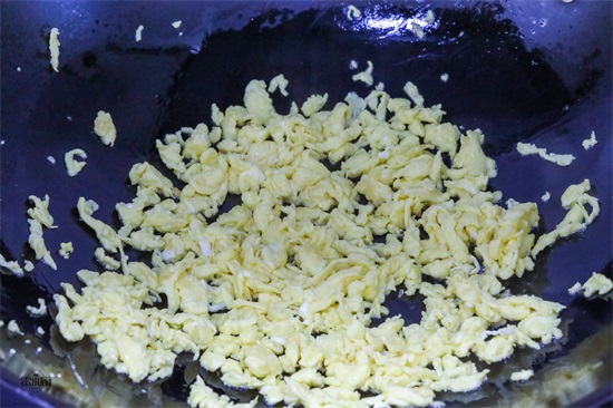2、取三个鸡蛋磕在碗里,热锅下油,倒入蛋液,用筷子迅速的划开,不断的搅拌,炒好的鸡蛋就小碎块了,也用再切,直接可以用。