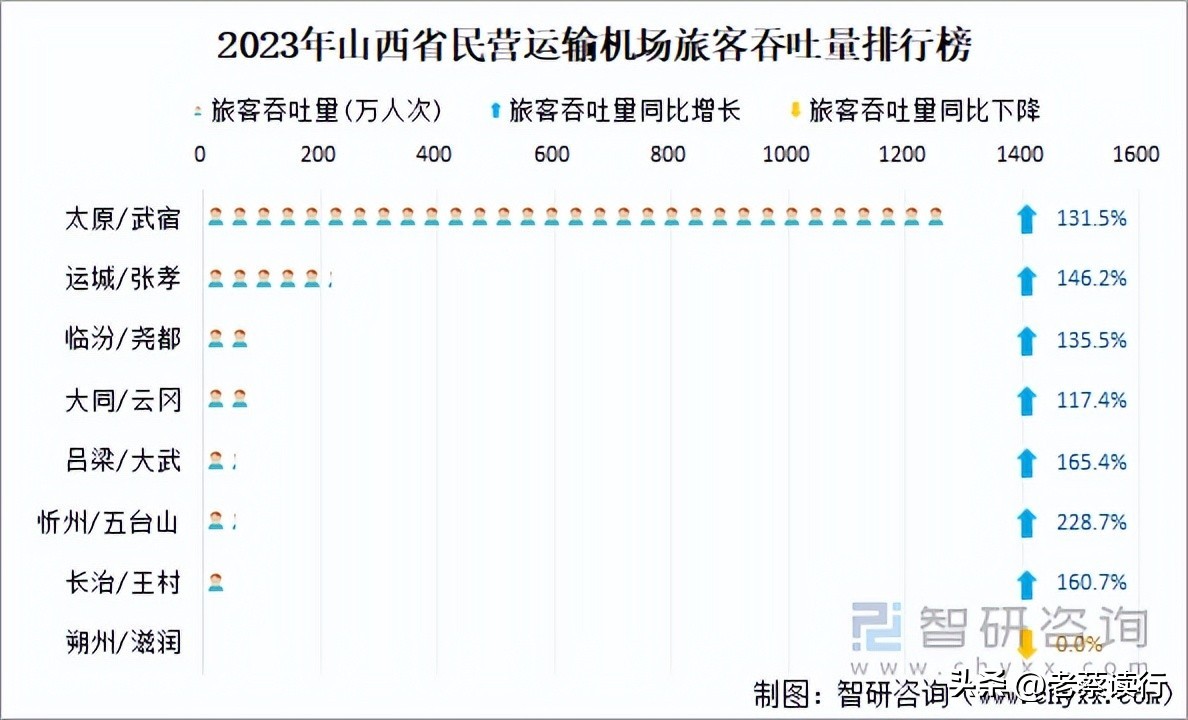 1、太原武宿国际机场,为4E级民用机场,是国内省会级干线机场。现有航站楼2座,跑道1条,机位43个;开通客运航线130条,通航城市72个,货运航线1条。2023年,太原武宿国际机场旅客吞吐量1280万人次,位居中国第33位。
