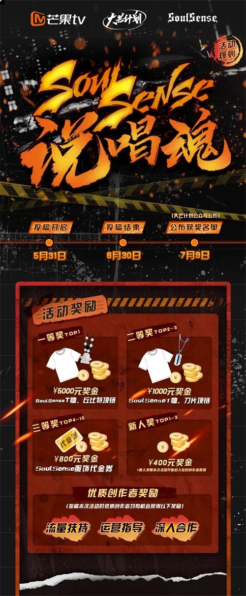 另外,鉴于活动并未要求是原创作品,所以,各位说唱爱好者们,机会来了!一等奖不但有5千元现金奖励,还可获得SoulSense定制T恤,活动奖励介绍见下图: