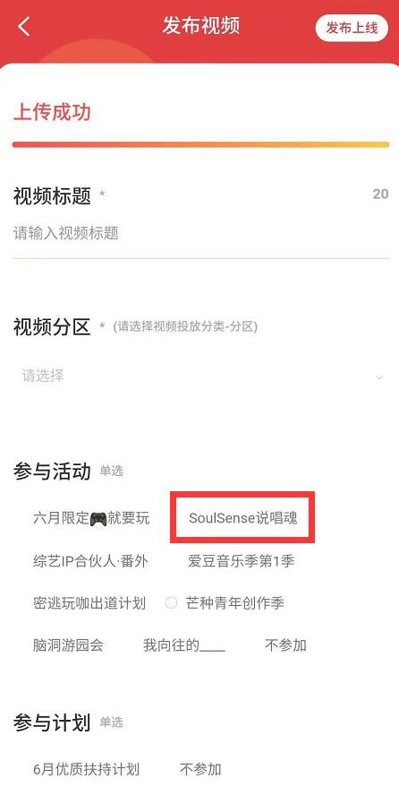 活动时间为即日起—6月30日,投稿分区在芒果TV App里选择【音乐】,活动标签勾选【SoulSense说唱魂】;