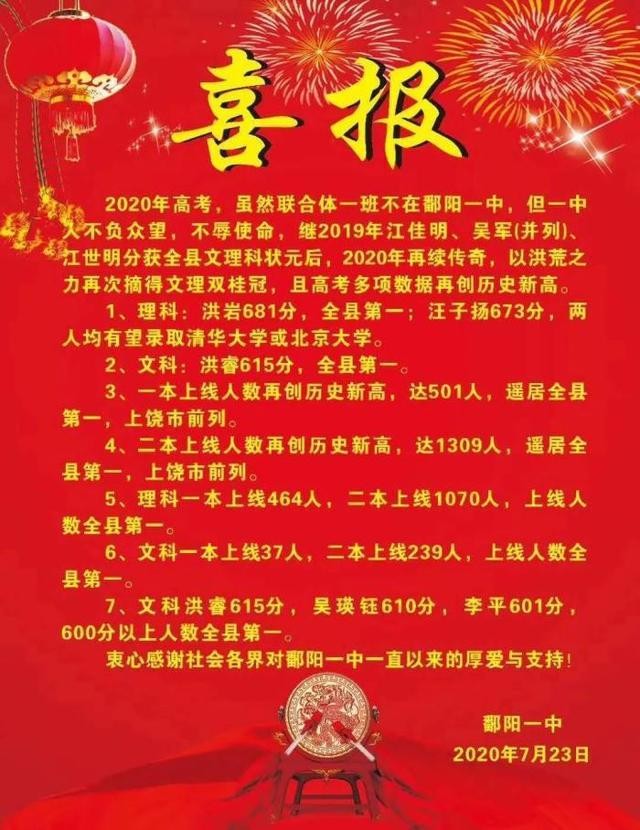 有些家长可能会被一本上线率误导,真的会。比如,小编就差一些被误导了。鄱阳的教育成败,取决于一个学校的高分考生有多少,有没有形成一个高分群体。就拿鄱阳民办高中来说,通过优待的方式争取几个优等生就读,总会在高考时捉襟见足。高分考生没有鄱阳中学多,不知道鄱阳一中有没有反思?