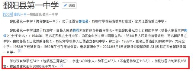 百科信息显示:鄱阳一中有教学班84个(包括高三复读班),学生14000余人,教职工467人(不含退休教工113人),校园占地面积168亩,校舍总建筑面积30000余平方米。而后面又有一句:学校现有教学班63个(全为高中),学生3270余人,校园占地面积128亩,校舍总建筑面积3000余平方米。
