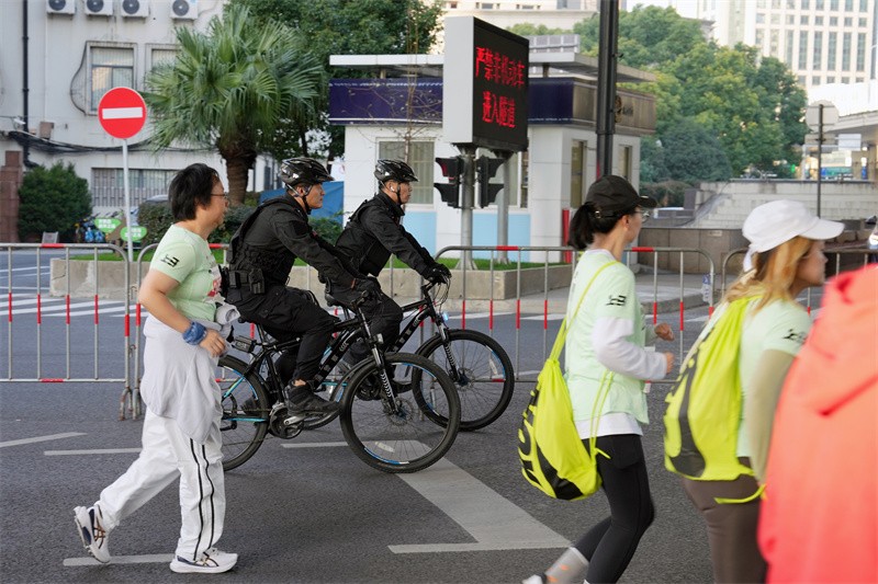 随着发令枪响,参赛选手们沿着中山东一路外滩向着终点前进,在比赛中,特警队员以自行车骑行的方式分段伴随,确保安保工作多层次覆盖。由于赛程中近半赛程在黄浦区域内,为此黄浦警方投入充足警力,在外滩、南京东路、淮海中路西藏南路等赛事沿线路段以及重点路口卡点安排交警、特警专人值守,结合外围交通分流疏导措施,确保赛事正常举办同时尽力减少对周边区域交通影响。比赛当天恰逢上海普通高校艺术类专业统一考试等一些涉及民生的出行安排,警方在相关区域、点位安排。