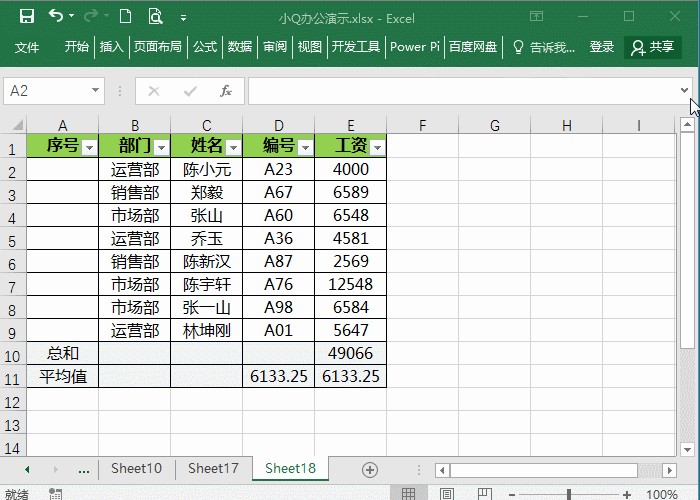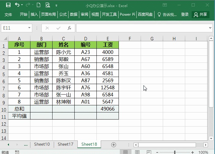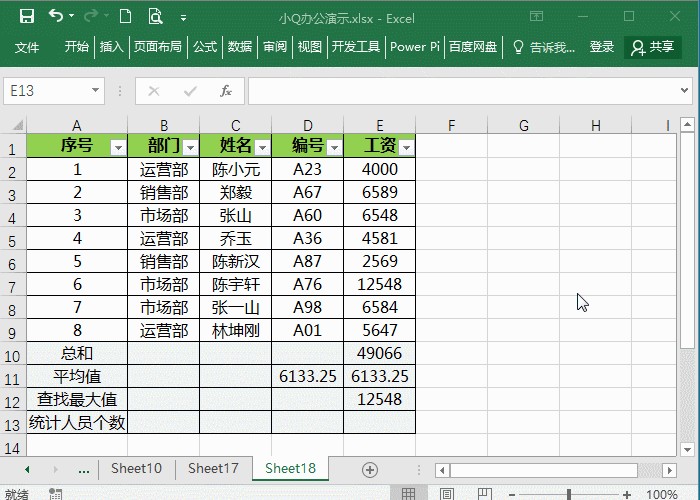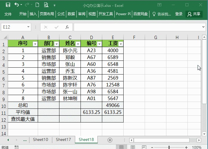 在单元格中输入=SUBTOTAL(1, E2:E9),并且在另一个单元格中输入=SUBTOTAL(101, E2:E9),当我们筛选部门,能清晰地看到功能代码101结果是会变化的。