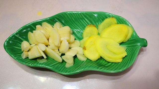 5、 姜蒜这些东西我们都切成片儿。如果喜欢味道大的,那么我们就可以多放一些。