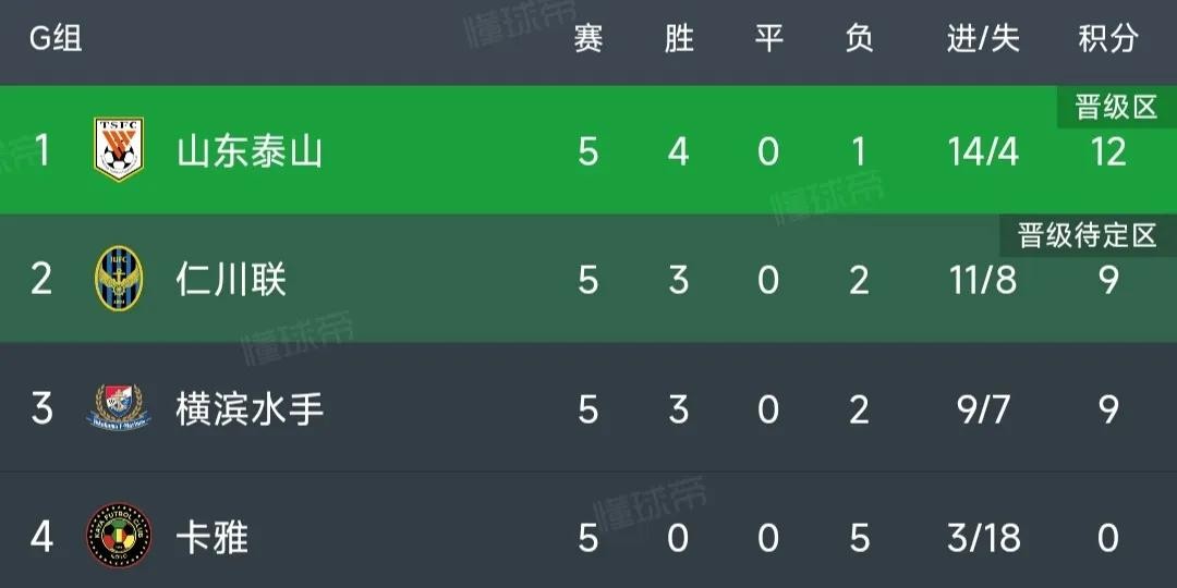 G组山东泰山4胜1负积12分位居榜首位置,仁川联和横滨水手3胜2负积9分位居第2和第3,卡雅五战全败积0分提前出局。