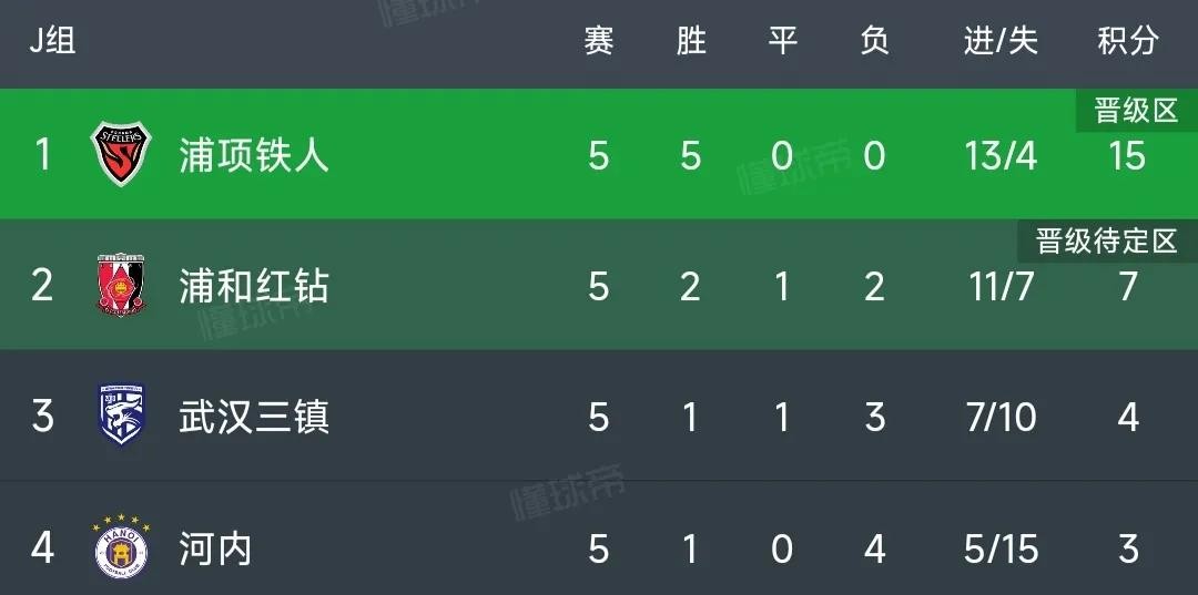 J组浦项铁人5连胜积15分稳居榜首,浦和红钻2胜1平2负积7分暂居第2,武汉三镇1胜1平3负积4分,河内1胜4负积3分垫底。