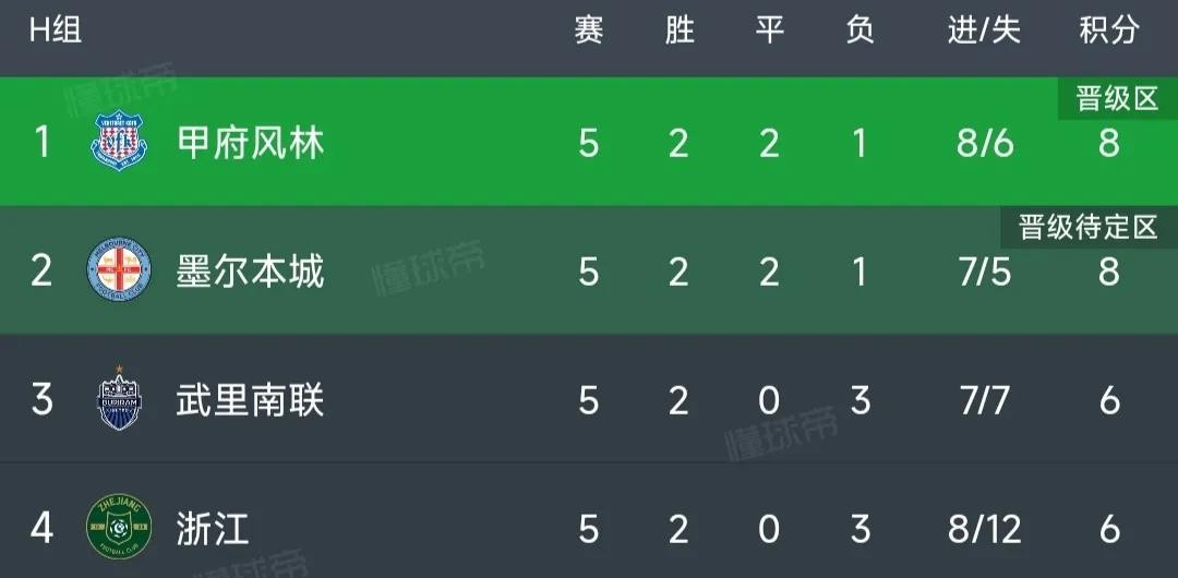 H组甲府风林和墨尔本城2胜2平1负同积8分位列小组前二,武里南联和浙江2胜3同积6分。