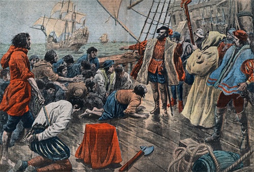 环球航行途中,斐迪南·麦哲伦成功平息了一场兵变,船员在十字架前宣誓效忠他