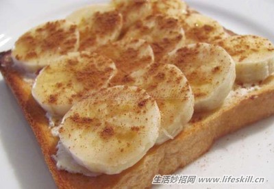 在吐司上面摆上切片的香蕉,你可以洒好砂糖在进烤箱烤,也可以烤完之后在淋上蜂蜜或枫糖浆!光想就觉得超美味,当早餐一定也很适合。