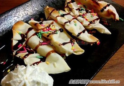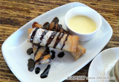春卷炸的酥脆的外皮搭配软软的香蕉,吃起来就像水果派吧!不管是沾炼乳或是巧克力一起吃绝对都超适合!