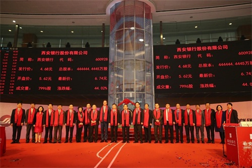 3月1日,西安银行股份有限公司在上海证券交易所主板成功上市,证券简称"西安银行",股票代码:600928,发行价:4.68元/股。上市首日,西安银行开盘即封涨停,股价报收6.74元,涨幅为44.02%。